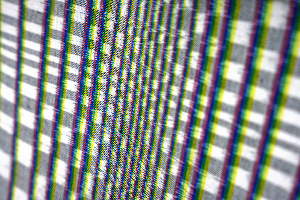 タテ糸にCMY色のストライプが並び、ヨコ糸に格子柄の絣が交わることで視覚効果が生まれている。