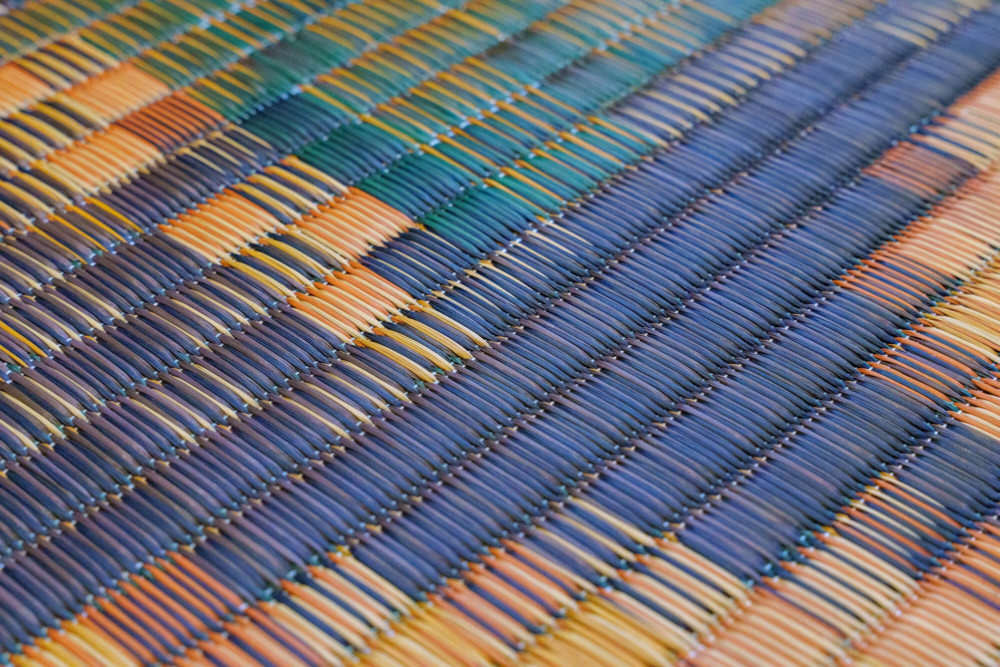 「PIXEL WEAVE – MONALISA -」と同じ6色のイグサを使用。配列の違いで異なる幾何学模様を表現している。 PIXEL WEAVEの考え方をより日用使いしやすいプロダクトに落とし込んでいる。
