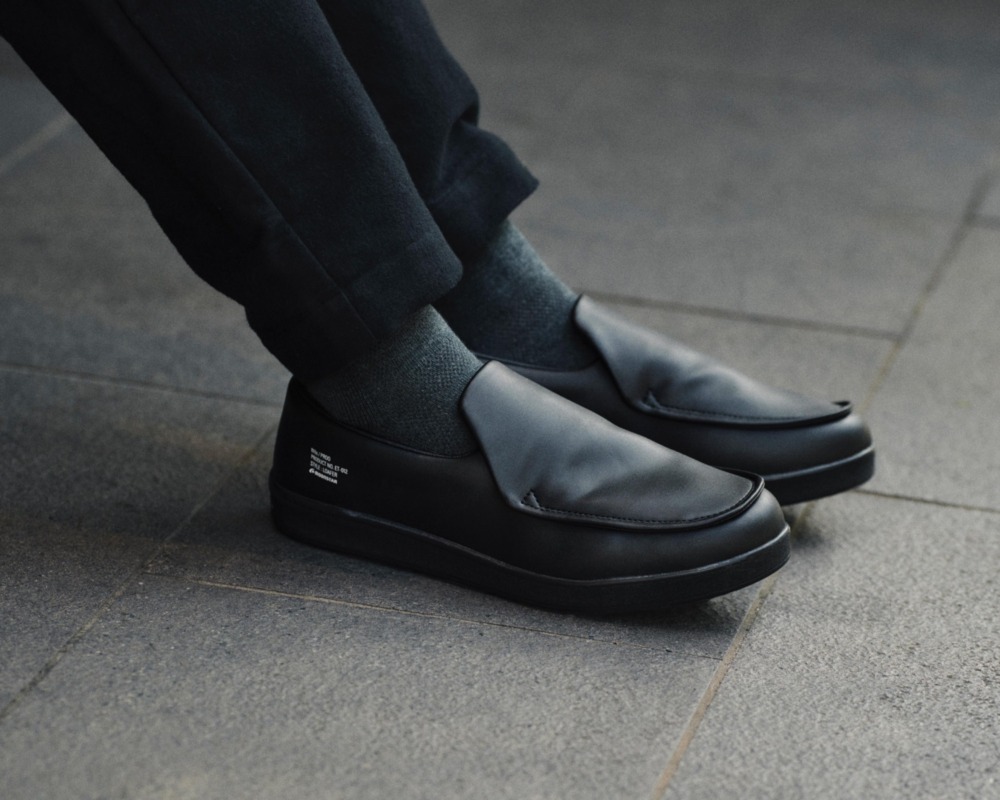 厨房や食品工場などで使われる「キッチンシューズ」を日常履き用に再構築した「PROO(プル―)」。食品を取り扱うワークシーンで履くことを想定し、水や油汚れや濡れた床でも滑りにくい仕様です。ローファータイプなので着脱もラクにできます。