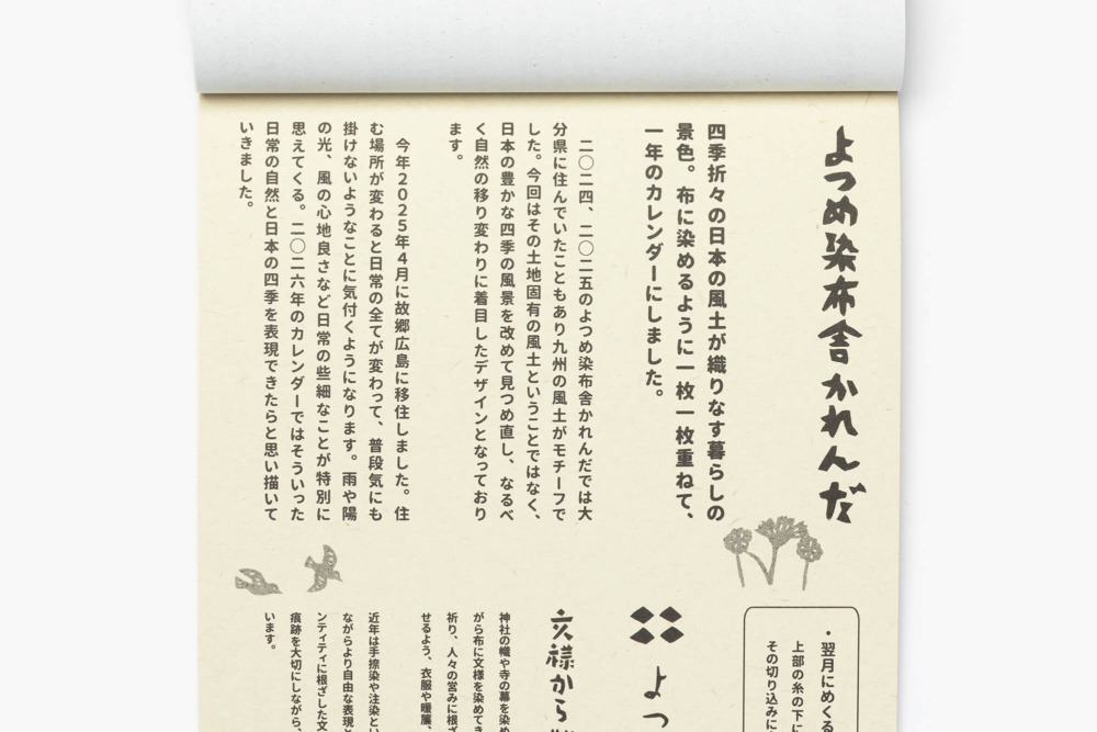 「染めを暮らしの中に」をモットーに、「型染・筒描」と呼ばれる日本の伝統的染色法による作品作りを行なっている「よつめ染布舎」の2026年版カレンダーが今年も発売しました。