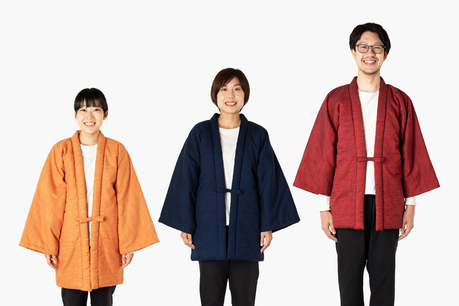 シルエットは、昔のはんてんに比べて袖や身幅がやや細く、すっきりとした仕上がりです。柄物が多いはんてんの中で、現代のライフスタイルに取り入れやすいよう、あえて無地でつくりました。男女兼用のワンサイズなので、ご家庭でみんなで着回すこともできます。中わたには、保温性と耐久性に優れた宮田織物オリジナルの混紡わた(綿80%/ポリエステル20%)を使用。
