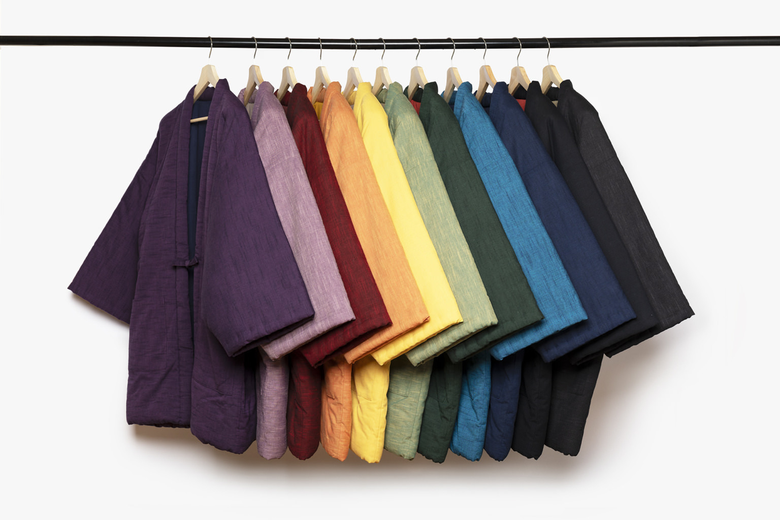 筑後のはんてんメーカー・光延織物とのコラボ商品で、わたに包まれるようなあたたかさはそのままに、現代のライフスタイルに合うシルエットへと再構築しました。室内はもちろん、外でも着やすい仕様で、男女兼用のワンサイズ。表生地には、光延織物で織り上げた綿100%の先染め生地を使用。中わたには、「新川桂」で生産された綿100%の超薄わたを採用しています。