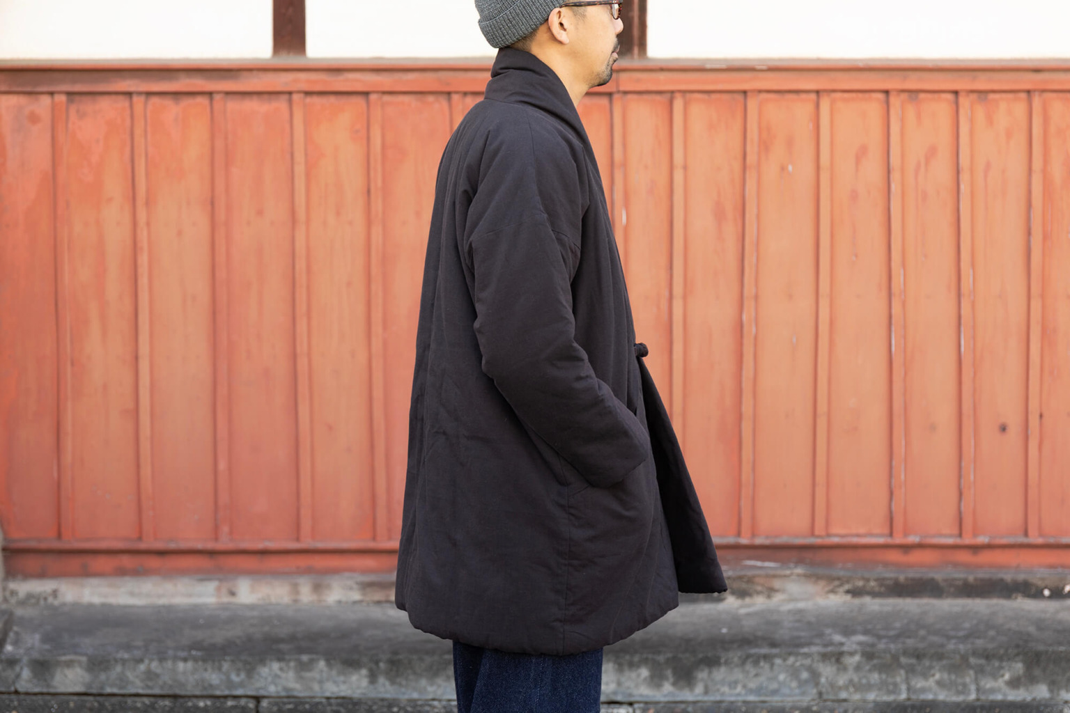 軽くてあたたかい「わた入れはんてん」を、部屋着だけでなく外出時にも着たい──。そんな思いから生まれた、コートタイプのはんてんです。