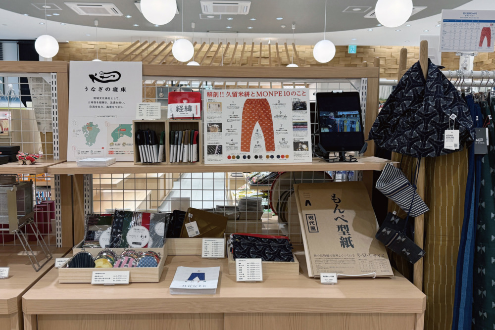 広川SA上り線は九州南部から福岡方面へ向かう途中の、八女ICと久留米ICの間にあります。この地域は、久留米市・大川市・柳川市・筑後市・みやま市・広川町・八女市・うきは市からなる筑後地域とよばれます。うなぎの寝床で取り扱っている商品のなかから、「筑後」の土地・文化と接点になるものとして、久留米絣のもんぺなどのオリジナル商品をはじめ、筑後の16つくりての商品を選んで紹介します。