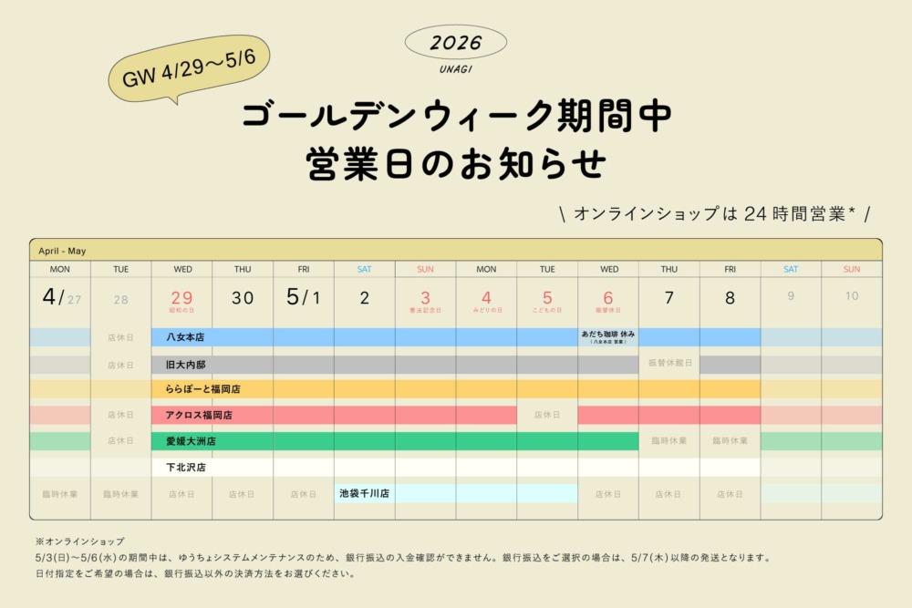 いつもうなぎの寝床にお越しいただきありがとうございます。2026年のゴールデンウィーク期間中【4/29(水・祝)〜5/6(水・祝)】の各店舗の営業についてご案内致します。