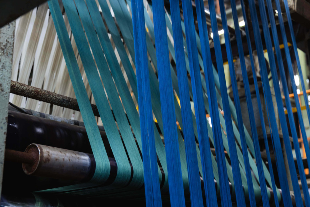 なぜジーンズは「色落ち」するのか?その秘密は、デニムならではの特殊な染色「ロープ染色」にあります。文字通りロープ状に糸束を吊った状態で引っ張りながら染めると外側だけが染まり、糸の中心部が白く残ります。その糸の表面が使ううちに削れて芯が露出することで、明るく色が落ちて見えます。ただ単に、色が抜けやすいわけではないのです。