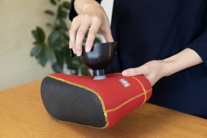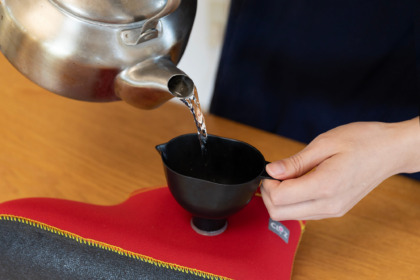 平らな場所で熱湯を注ぎます。じんわり熱が伝わるため、カバーなしでそのままお使いいただけます。