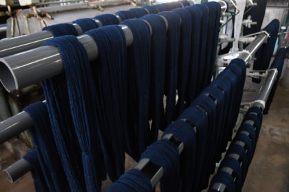 このMONPEにつかっているよこ糸は、筑後染色協同組合(福岡県筑後市)が2012年に開発した藍染め専用の機械を使い、インド藍で6回染めています。