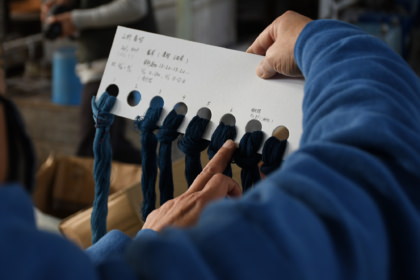 染めの回数や染まり具合に関しては、山村かすり工房が藍染した糸とのバランスを両者で考え、何度も試験を繰り返して調整していきました。その結果、このMONPEの生地は無地ですが、たて糸とよこ糸の濃淡の差で深みのある色合いがあり、表情が生まれています。