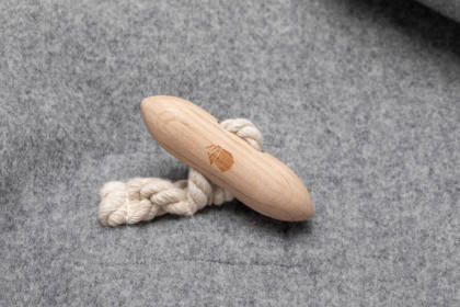 シャトルの形のトグルボタン岐阜県高山市にあるおもちゃをつくる工房で、固い樫の木を一つ一つ削って作られています。織機でよこ糸を打つ際に使うシャトルを模した形です。