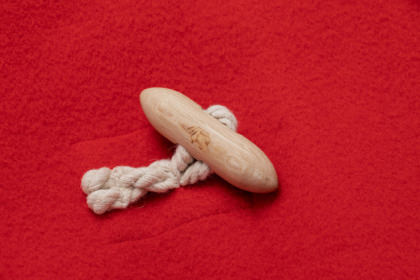 岐阜県高山市にあるおもちゃをつくる工房で、固い樫の木を一つ一つ削って作られています。織機でよこ糸を打つ際に使うシャトルを模した形です。