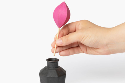 山鹿灯籠は、灯籠師とよばれる職人の手によって、のりしろのない紙の小口(厚み)の部分を少量の糊で貼り合わせるという精巧な技術で作られています。その技術をもとに、山鹿灯籠で使用する部品のモチーフを再構成して、アロマ空間を演出するディフューザーとなりました。