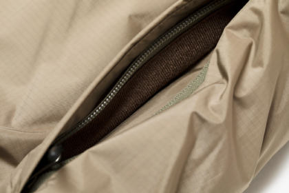 防水加工を施したナイロン生地でありながら、ダウン内部からの湿気を外に逃がしてくれるので、羽毛の調湿効果を損いません。また、表面の縫い目を可能な限り減らし、縫い目からの雨の侵入を最小限に抑えています。