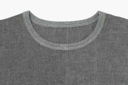 Tシャツは、伸縮性のある「編物(ニット)」でつくることが一般的です。このTシャツを久留米絣という伸縮性のない「織物」で実現するために、襟のゴム編みや裾のスリットなどの仕様を設計しています。これによりTシャツとしての脱ぎ着しやすさや動きやすさを損なわずに、久留米絣の風合いを体感できるTシャツに仕上がりました。