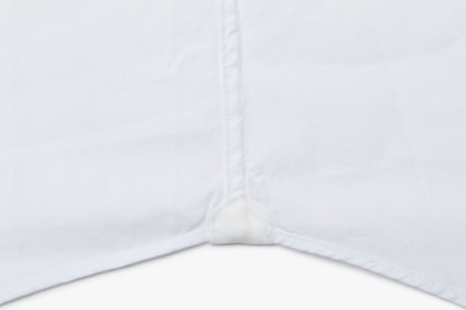 ・襟、カフス、前立てをきっちりあげるために、トップヒューズ芯(永久接着芯)を使用しています。そのため、高温(170°以上)で芯地部分にアイロンを掛けると縮みや変形が発生する場合がありますので、ご注意ください。