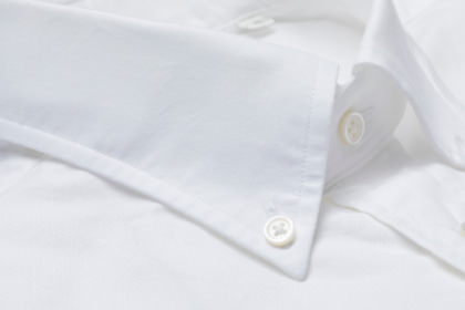 適度なロール感を持ったボタンダウンシャツ特有の衿の形に仕上げるために、1枚1枚ボタン位置を1mm単位で調整しています。左右のボタン位置や高さに差をつけてバランスをとることで、左右の衿先が平行となり、着用した際に自然な仕上がりです。