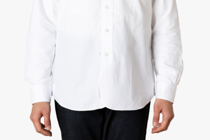 その昔は、シャツは下着も兼ねていたので、裾が長い仕様だったとか。そんなクラシカルな形を再現するべく、デザインに取り入れた特徴的な裾です。ボトムアウトして着用しても楽しめるような裾のアクセント、カーブなどにも注目です。