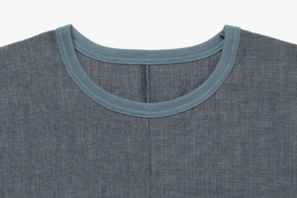 Tシャツは、伸縮性のある「編物(ニット)」でつくることが一般的です。このTシャツを久留米絣という伸縮性のない「織物」で実現するために、襟のゴム編みや裾のスリットなどの仕様を設計しています。これによりTシャツとしての脱ぎ着しやすさや動きやすさを損なわずに、久留米絣の風合いを体感できるTシャツに仕上がりました。