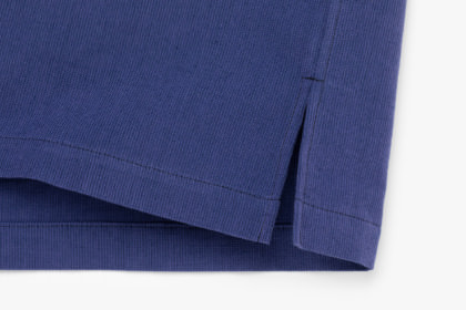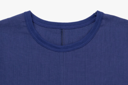 Tシャツは、伸縮性のある「編物(ニット)」でつくることが一般的です。このTシャツを久留米絣という伸縮性のない「織物」で実現するために、襟のゴム編みや裾のスリットなどの仕様を設計しています。これによりTシャツとしての脱ぎ着しやすさや動きやすさを損なわずに、久留米絣の風合いを体感できるTシャツに仕上がりました。