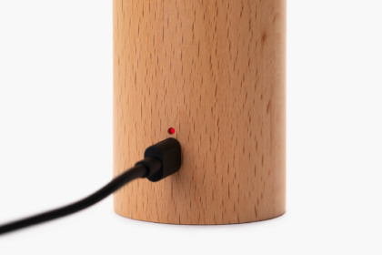 八女提灯の技術、和紙の特徴を活かした提灯の部分と、そこにフィットさせるため模索しながら開発を続けた木製の円柱部分を組み合わせ、どこでも手軽に持ち運びしやすい形の現代の提灯をつくりあげました。上部は和紙、下部は木製なので、頭が大きく、支柱が細めという見た目の割には、重心が低く安定感のあるフォルムです。