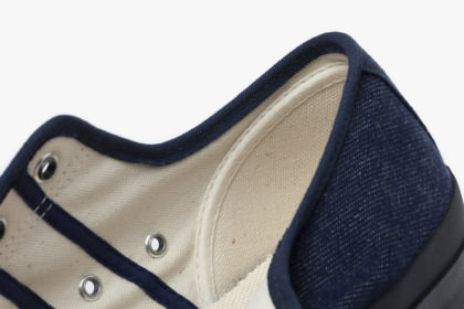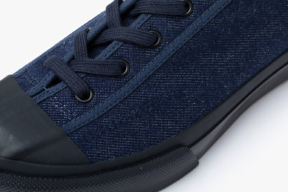 福岡県・筑後地域で織られたデニム生地。1990年代、アパレルブランドとのコラボシューズ製造時に使われていたデッドストック生地を再利用。