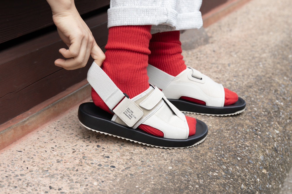 甲部分のベルトは、両側とも取り外しができる「両開き」のマジックテープ仕様。足の形に合わせて細かく調整できるのはもちろん、脱ぎ履きの際もストレスフリー。厚手のソックスを履いたままでもスムーズに足入れが可能です。